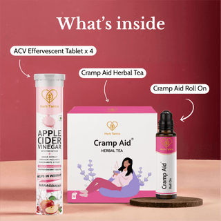 Support hormonal health naturally with this trio of - Apple Cider Vinegar Effervescent Tablets (with The Mother, Ginger, and Chromium Picolinate), Cramp Aid Roll-On and the Cramp Aid Tea which helps manage cravings, balance insulin levels, and reduce bloating. |